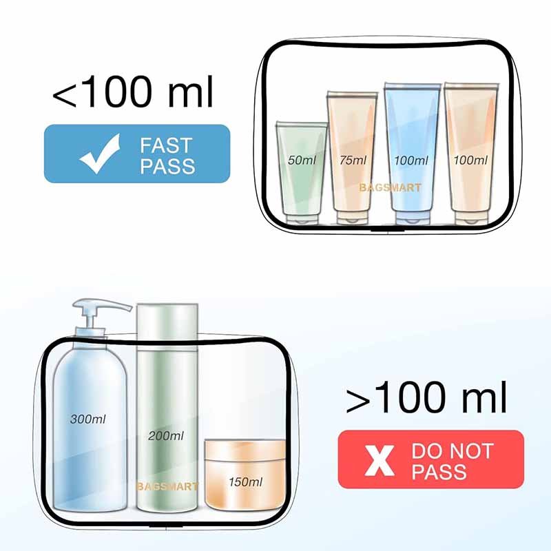 | 100 ml max per container | Bag should fit small bottles, tubes, and jars |